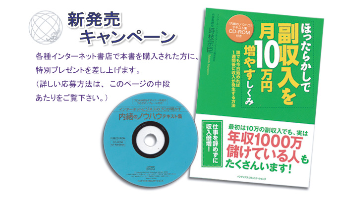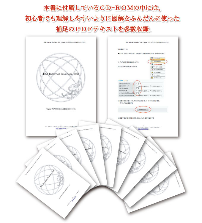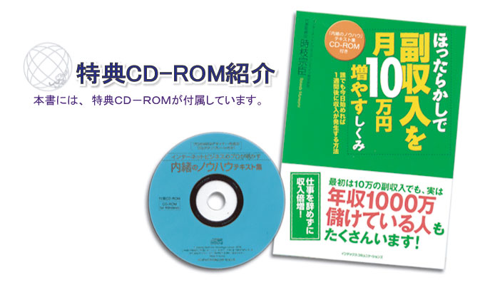本書を手にしていただいたあなたには、本書だけでほったらかしで収入を生むしくみを作っていただきたいのです。そういった思いのもと、本書では付録の特典CD-ROMの中に、初心者でも理解しやすいように図解をふんだんに使ったテキストや、しくみづくりに役立つものを多数収録することにしました。